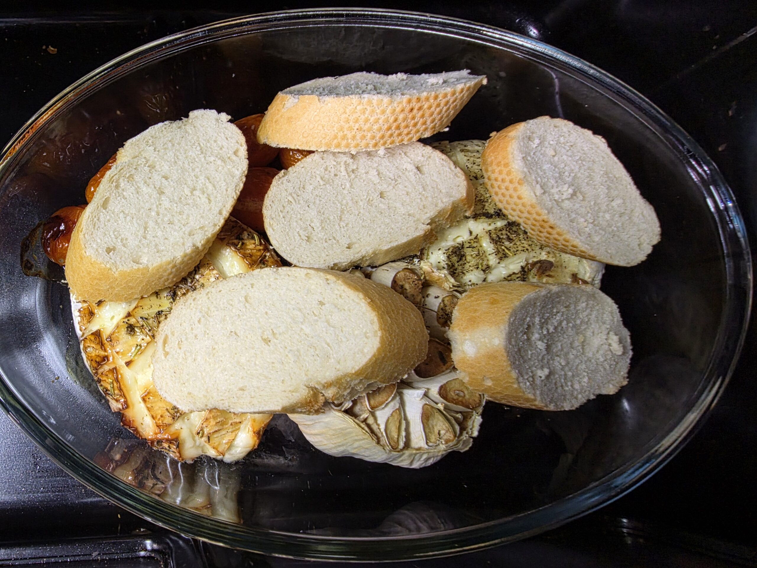 Pridaj nakrájanú bagetu a peč ďalších 5–7 minút, aby bola chrumkavá.