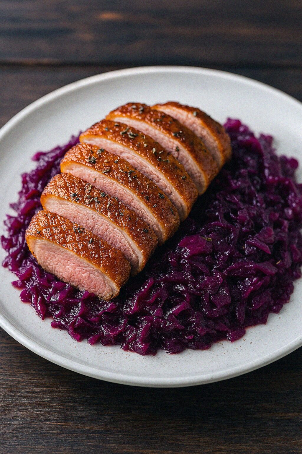 Kačacie prsia nakrájaj na plátky, podávaj na dusenej kapuste.