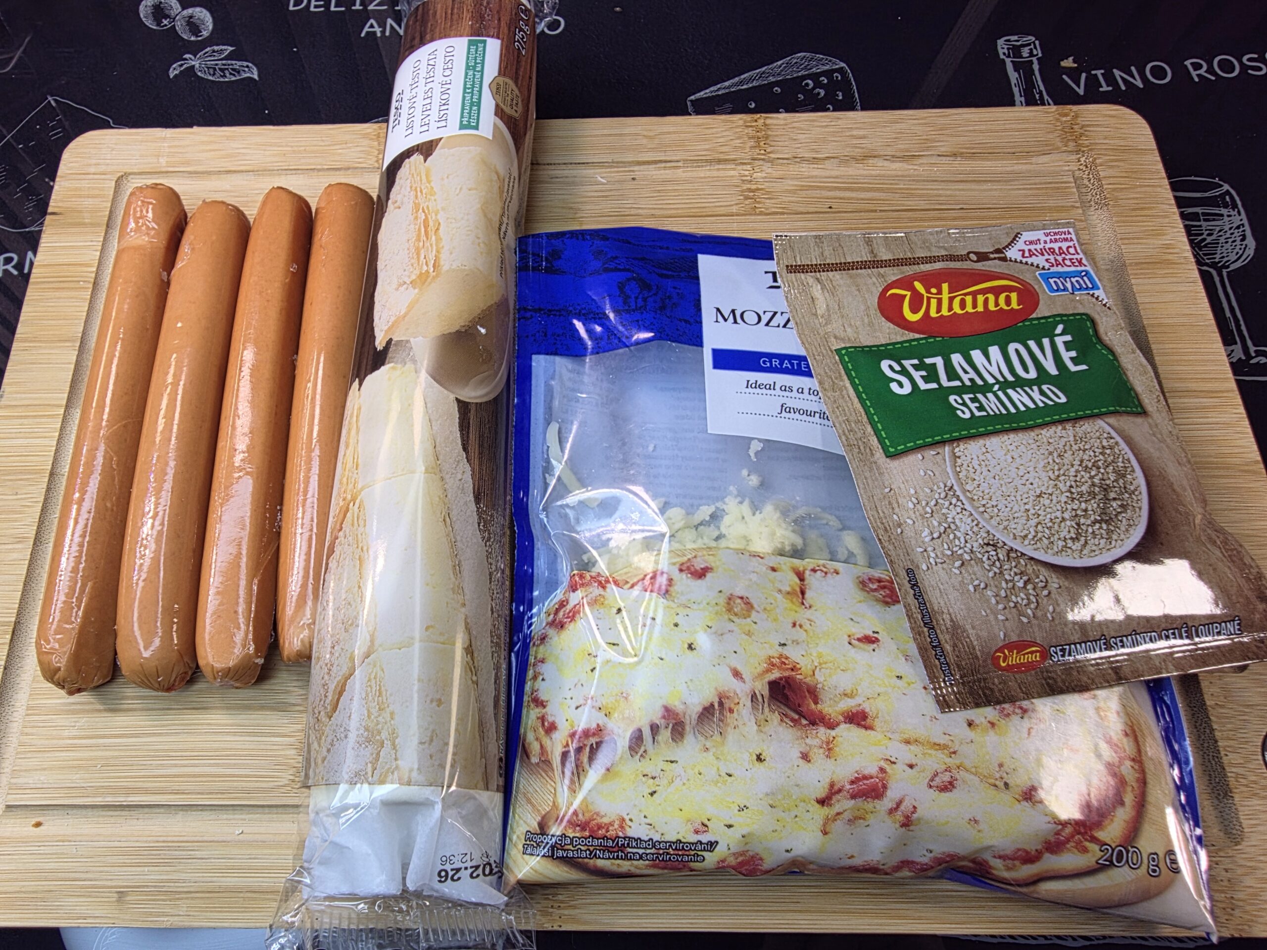 Párky poukladaj do košíka fritézy, potri vajíčkom a posyp sezamom a strúhaným syrom.