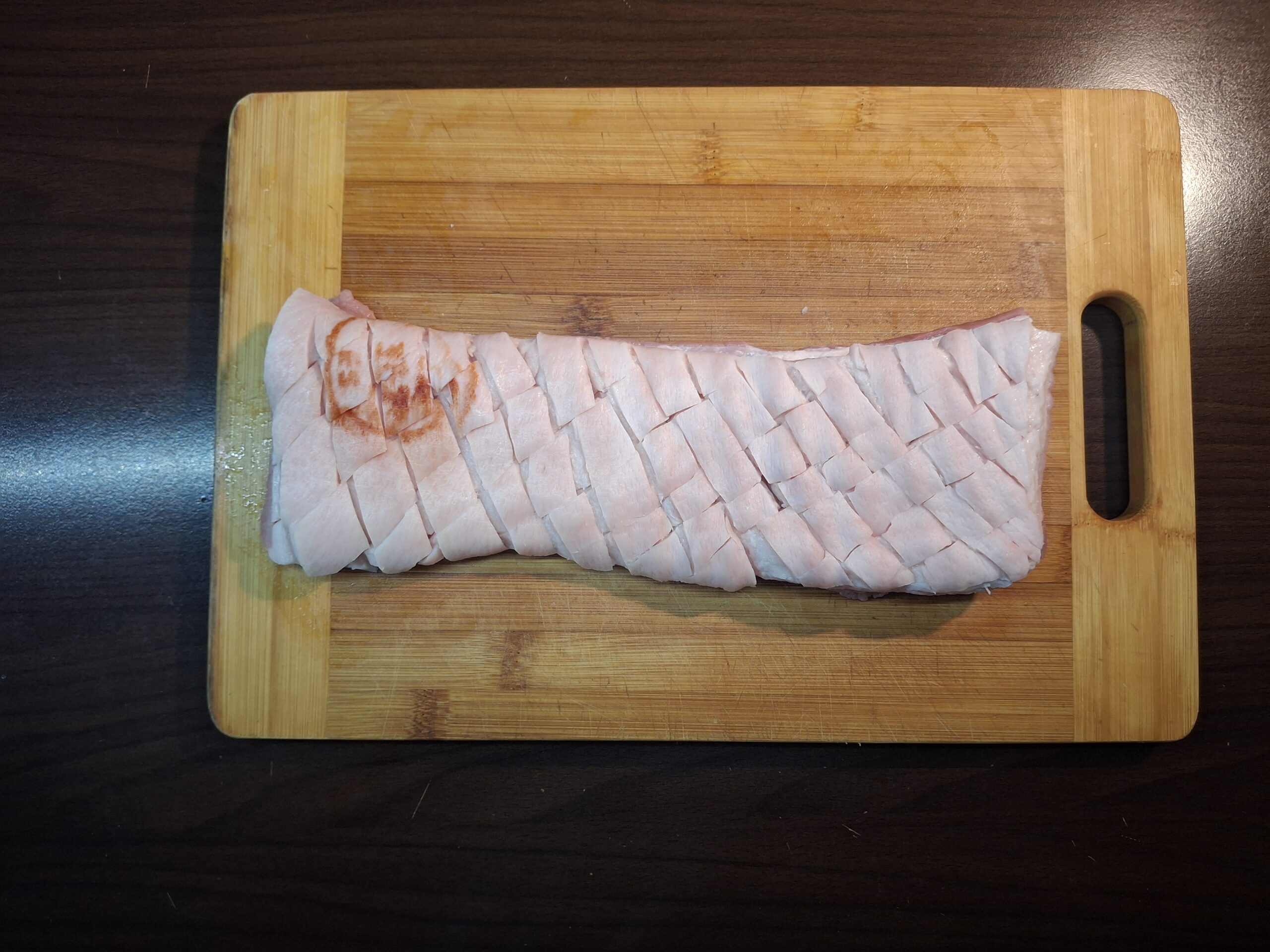 • Narezanie kože: Bôčik osušte papierovou utierkou, aby bol suchý ako saharská púšť. Ostrým nožom narežte kožu do mriežky – rezy hlboké 0,5–1 cm, vzdialené asi 1 cm od seba. Rezať treba len tuk pod kožou, nie mäso! Tento krok je svätý grál chrumkavej kôrky, tak si dajte záležať.