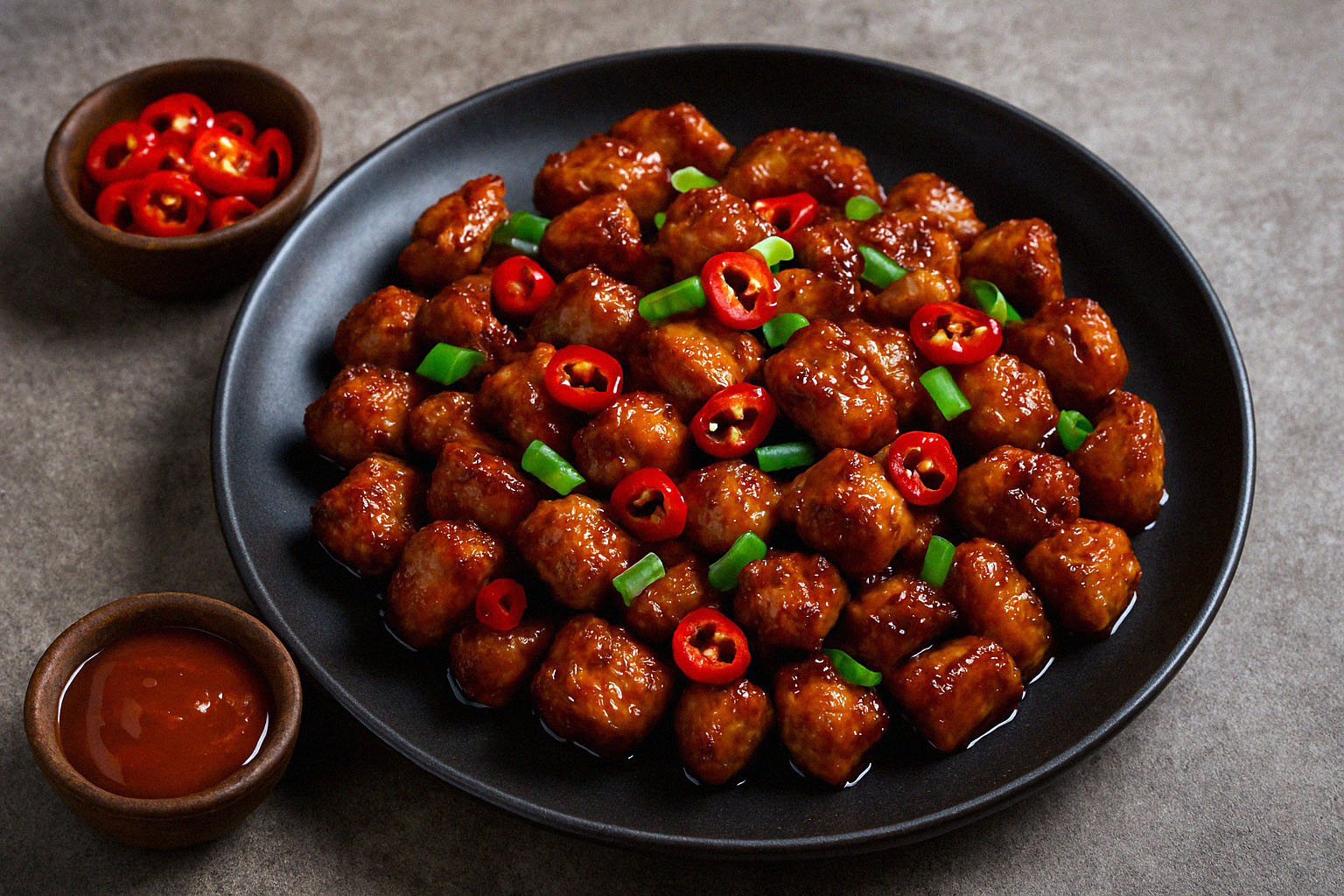 Bravčové mäso, nakrájané na malé kúsky, sa najprv kúpe v marináde plnej medu, čili omáčky, cesnaku a zázvoru. Táto zmes nie je len o chuti – je to elixír, ktorý preniká do mäsa a dodáva mu charakter. Po krátkom odpočinku v marináde sa kúsky mäsa premenia v teplovzdušnej fritéze na zlatisté, jemne karamelizované kúsky s chrumkavým povrchom a šťavnatým vnútrom.